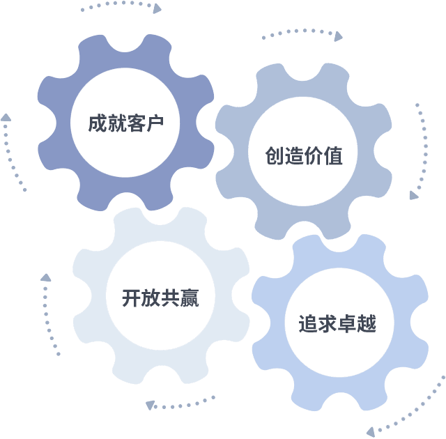 成就客户是一切决策的出发点,,创造价值是衡量所有工作的标准,,追求卓越是我们做事做人的态度,,,开放共赢是我们的格局也是最终的结果。。价值观的齿轮环环相扣,,推动着组织里的每个人不断向前。。。。